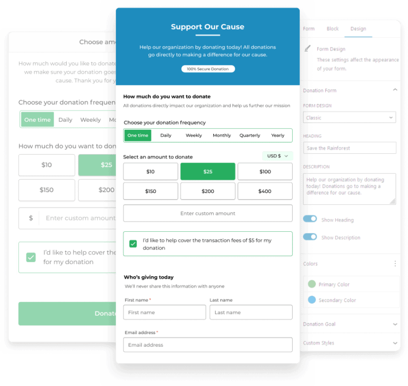 We offer templates, like classic, developer, or multi-step forms, for you to choose from. We personalize forms with primary and secondary colors to reflect your organization’s brand identity. We optimize donation forms by integrating custom styles with CSS, curated to meet your preferences.